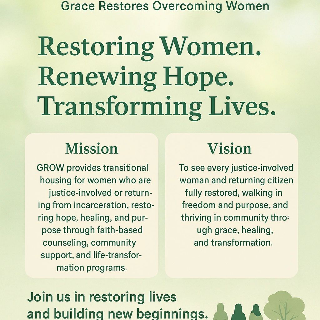 GROW is a 501- 3 (c) not-for-profit organization that offers women that are recently released from incarceration a safe and secure home, in which they can re-build their lives. Additionally, GROW offers a variety of services designed to help women build confidence and life skills.